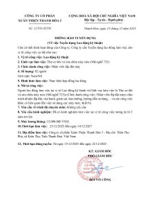 Căn cứ tình hình hoạt động của Công ty, Công ty cần Tuyển dụng lao động làm việc cho vị trí công việc cụ thể như sau: